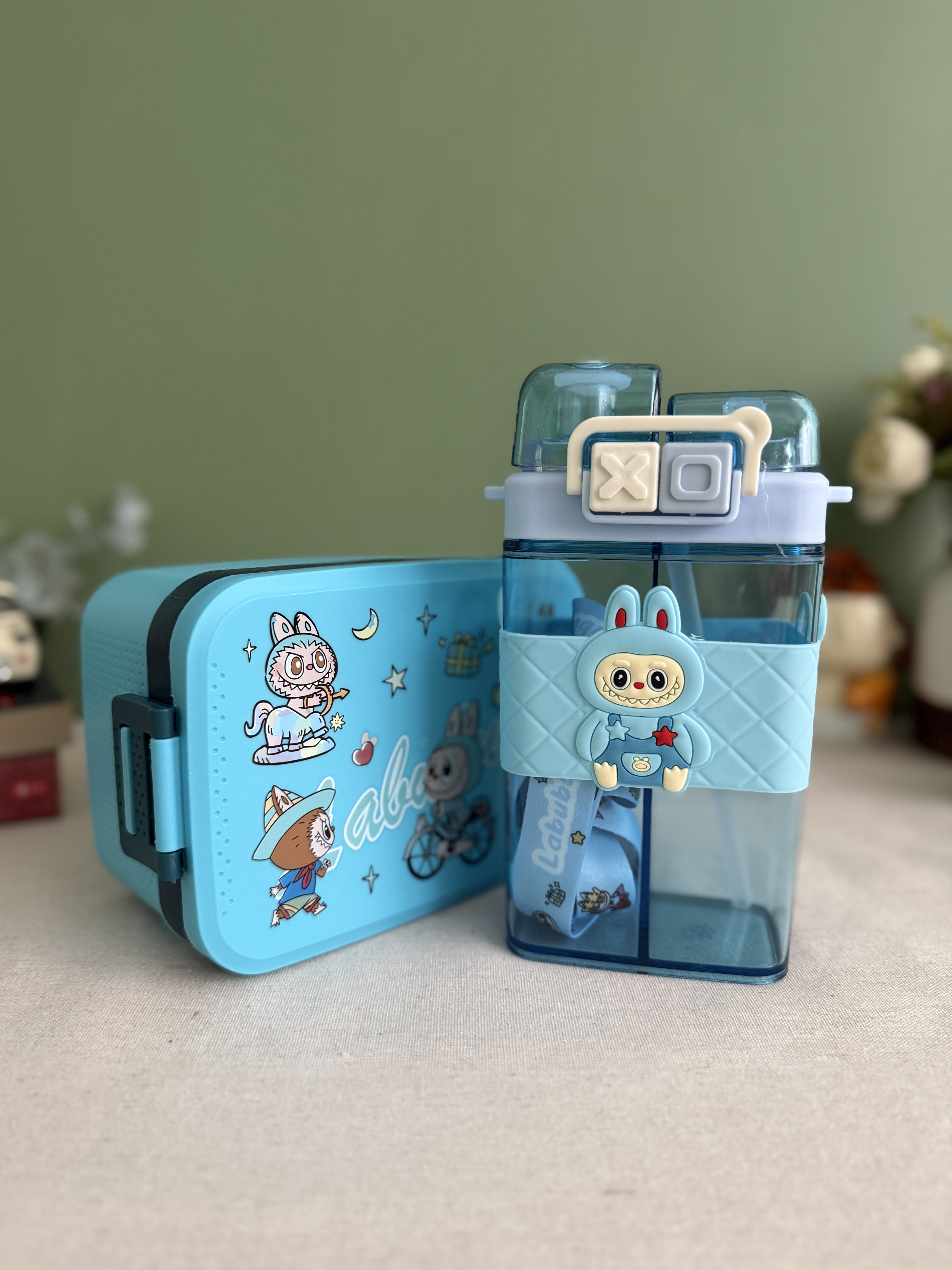 ست لانچ باکس استیل و قمقمه دو مخزنه وارداتی طرح لبوبو (آبی)