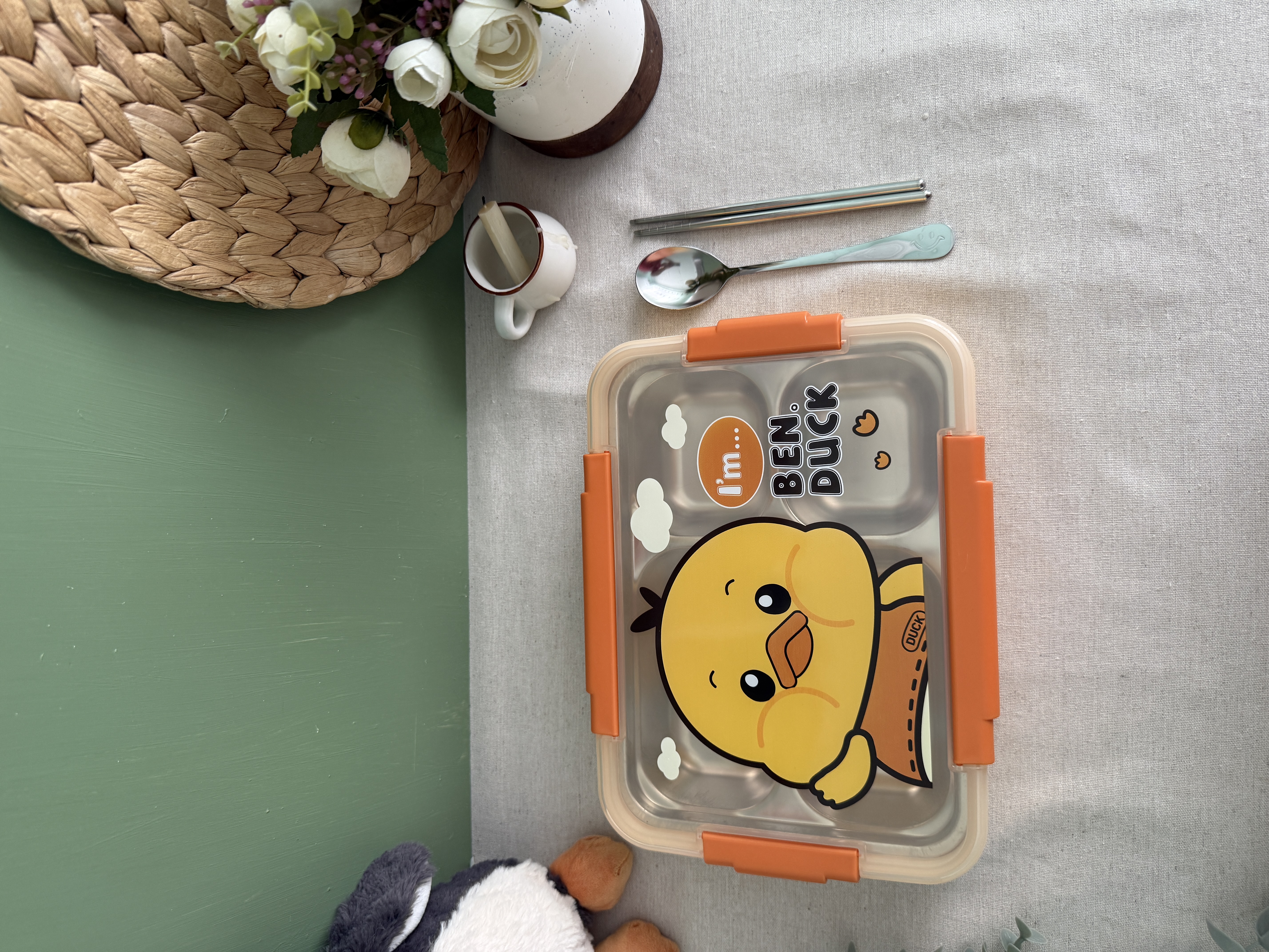 لانچ باکس فلزی طرح جوجه همراه قاشق و چاب استیک(جعبه دار)