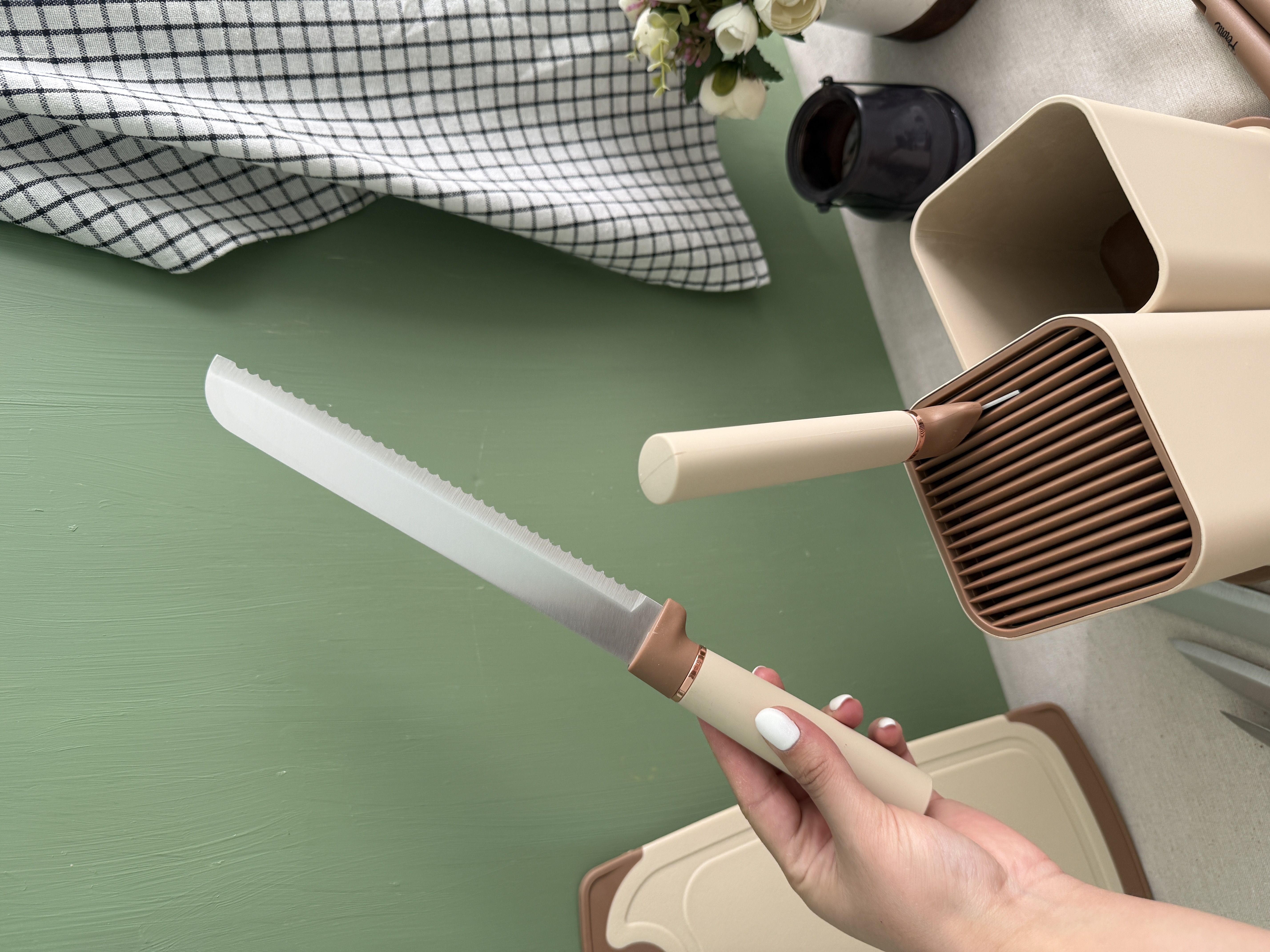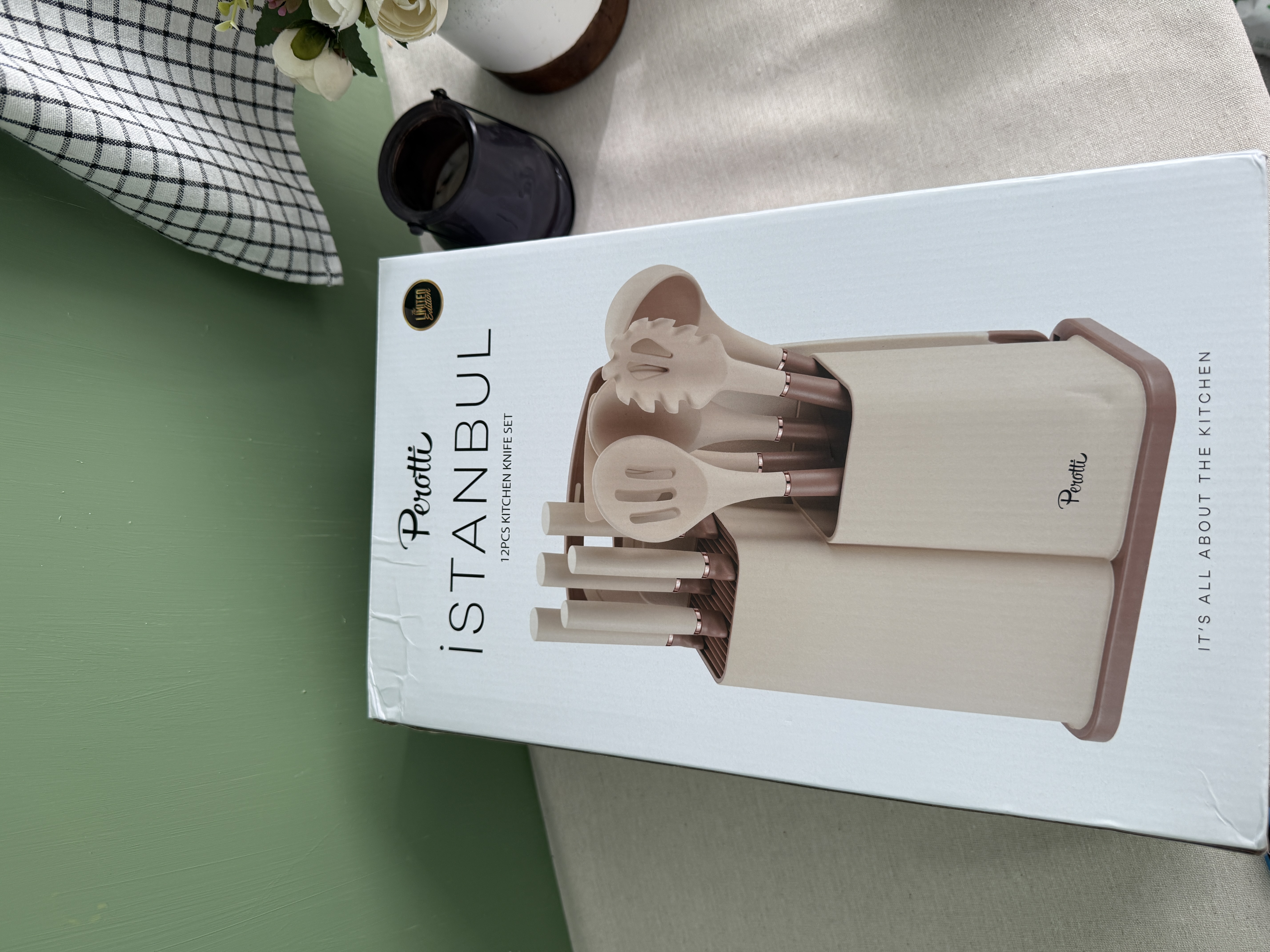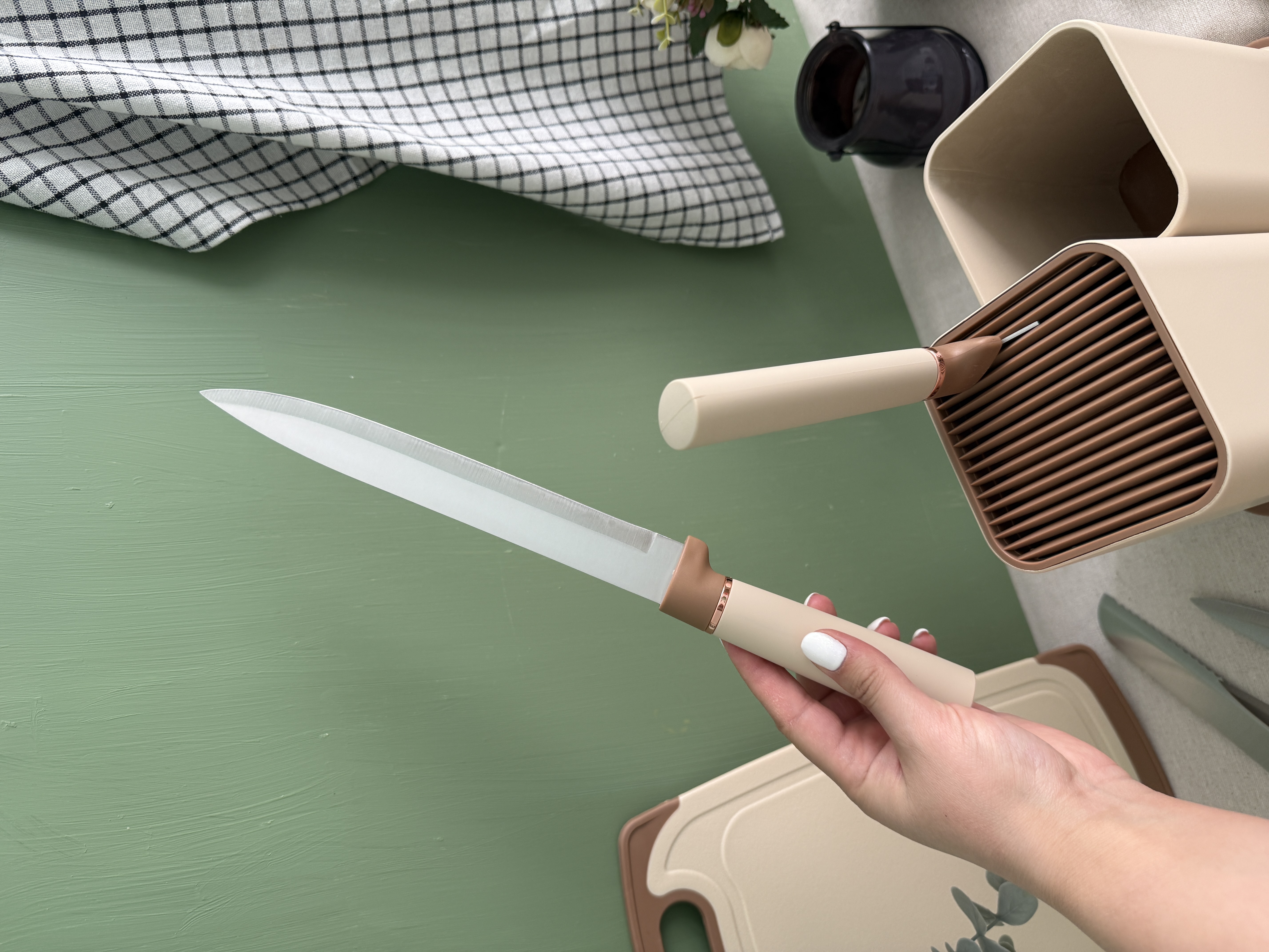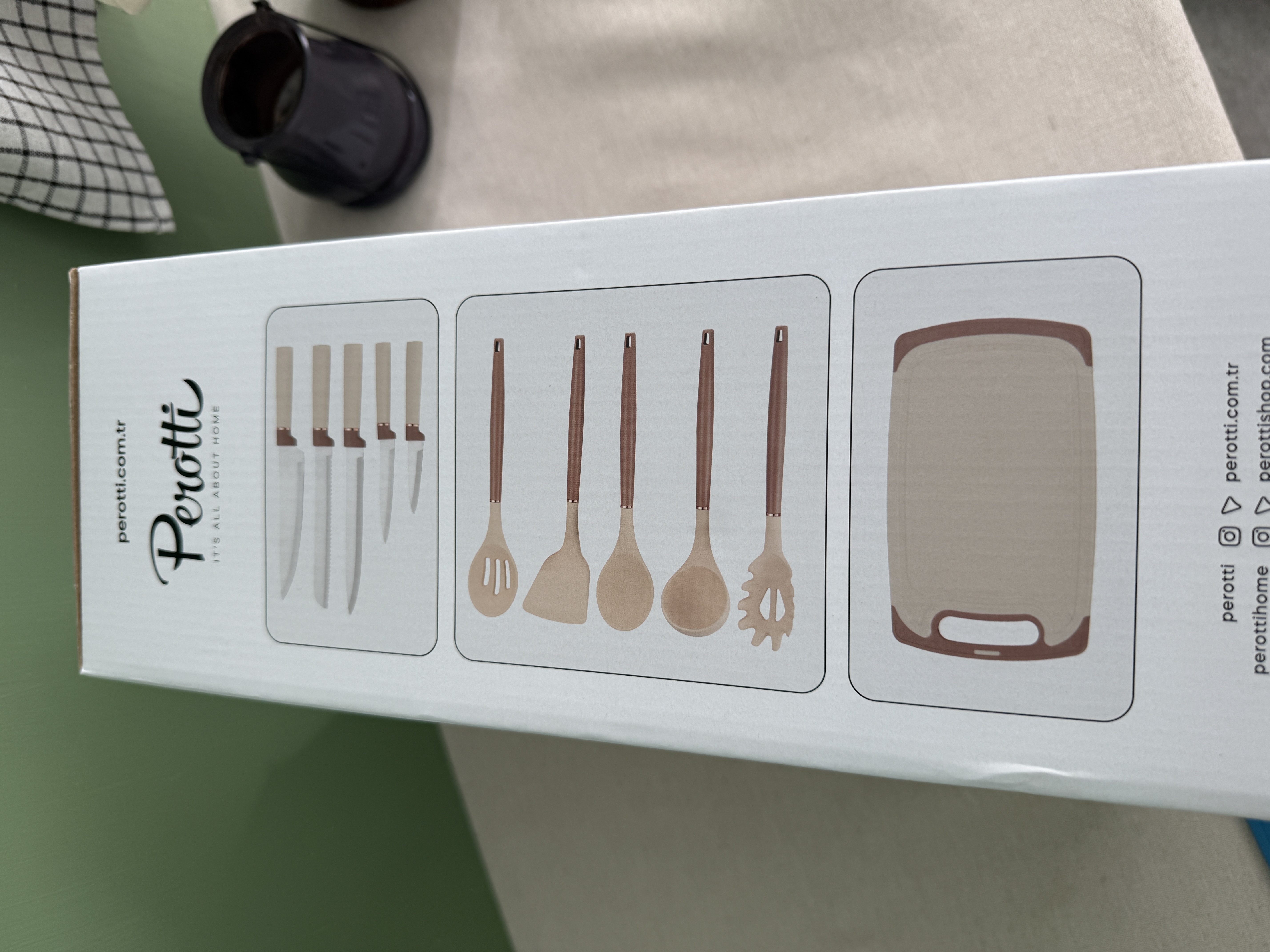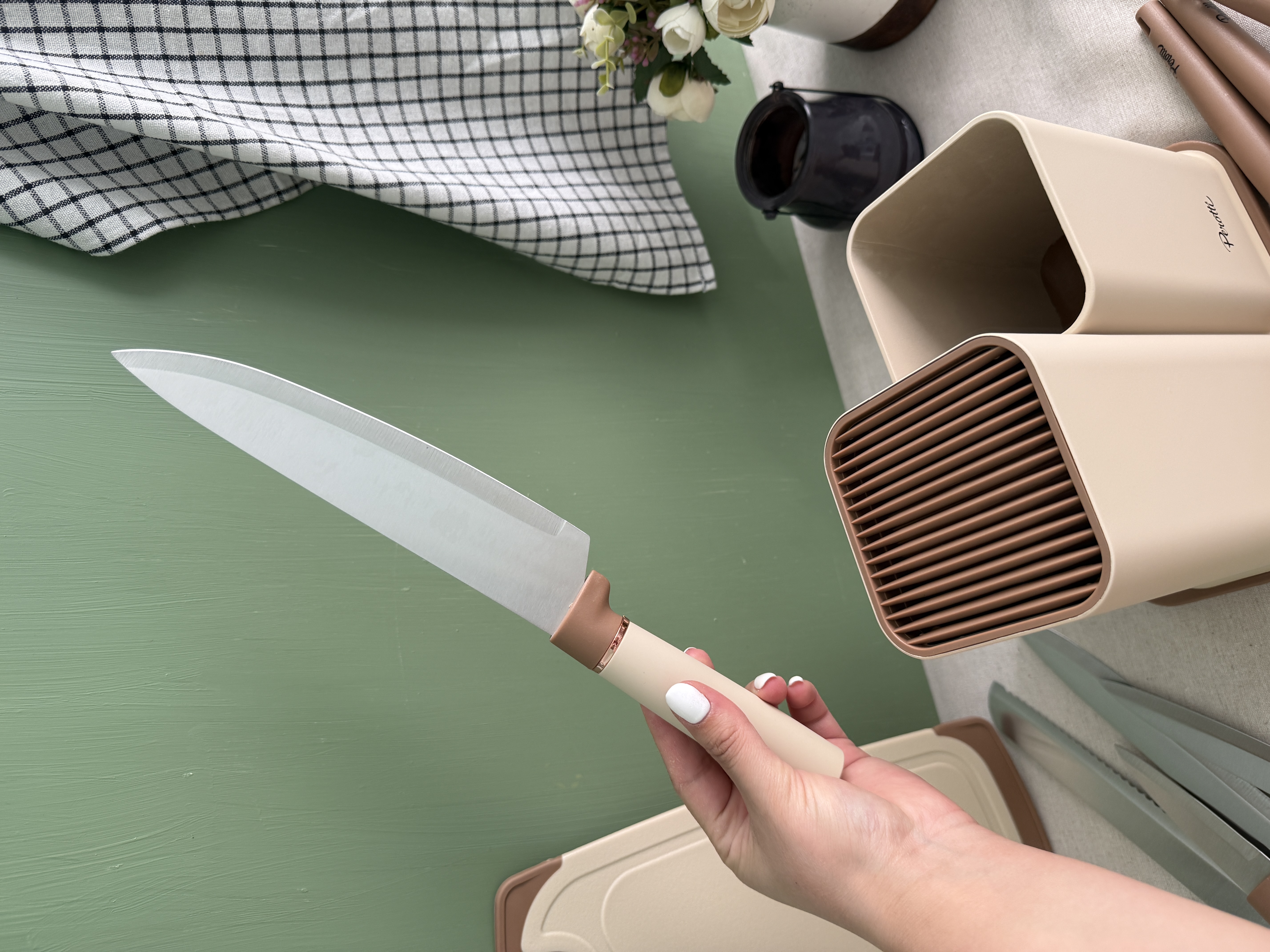 محصول وارداتی شامل استند مخصوص و جا ابزاری تخته برش ۵ عدد چاقوی تیز در سایز های مختلف دسته سیلیکونی ۵ تیکه کفگیر و ملاقه سیلیکونی دسته بامبو