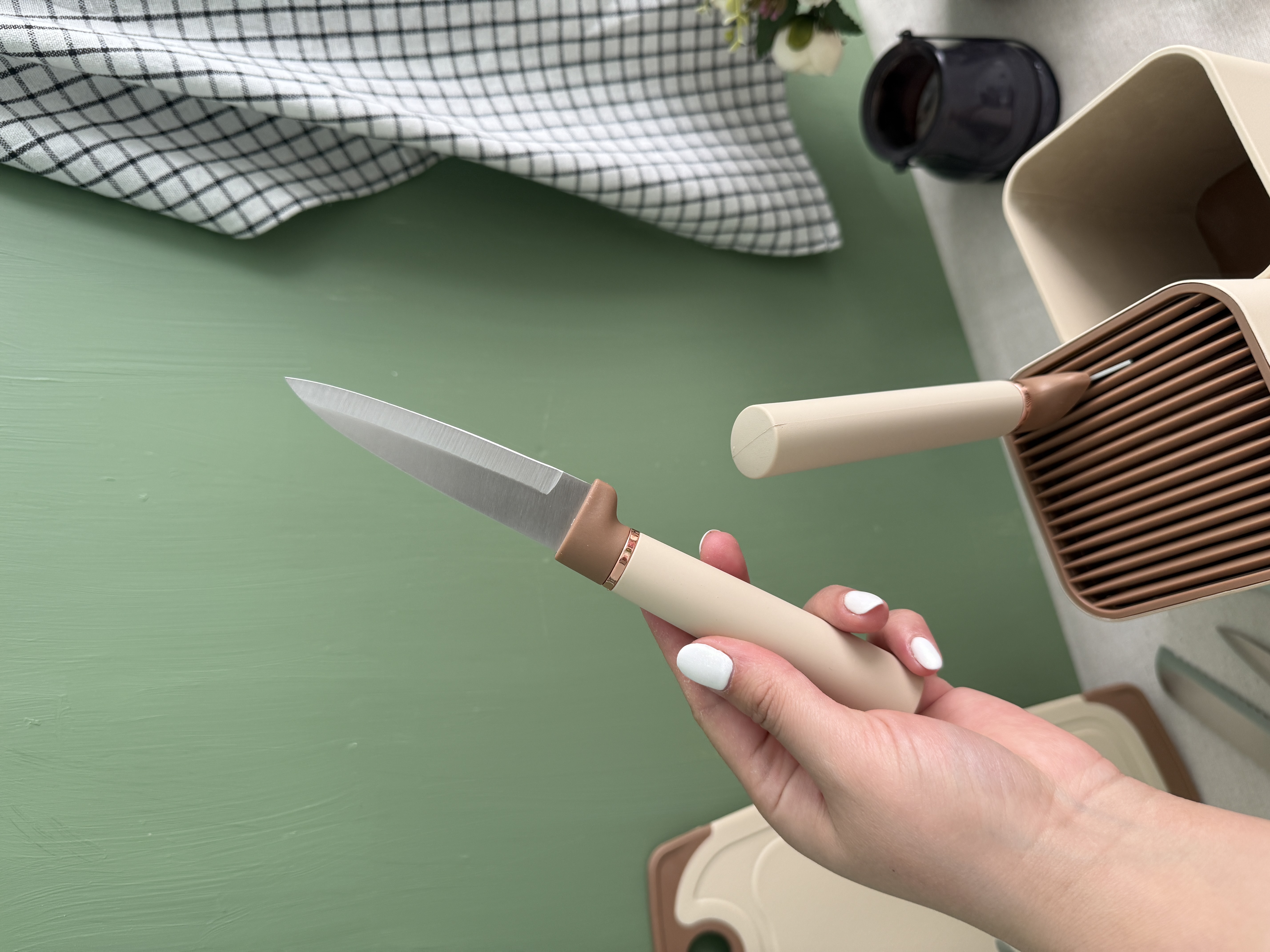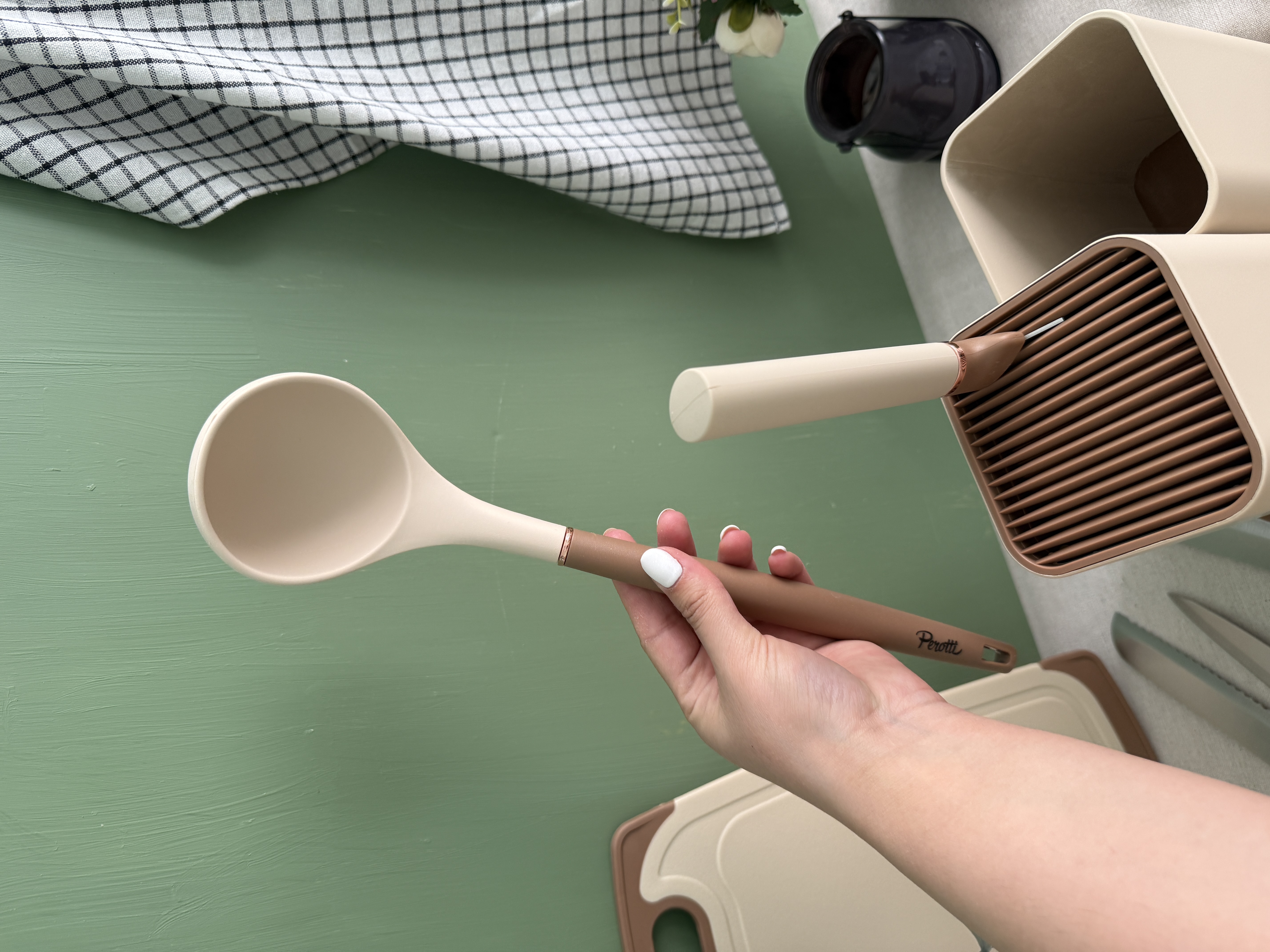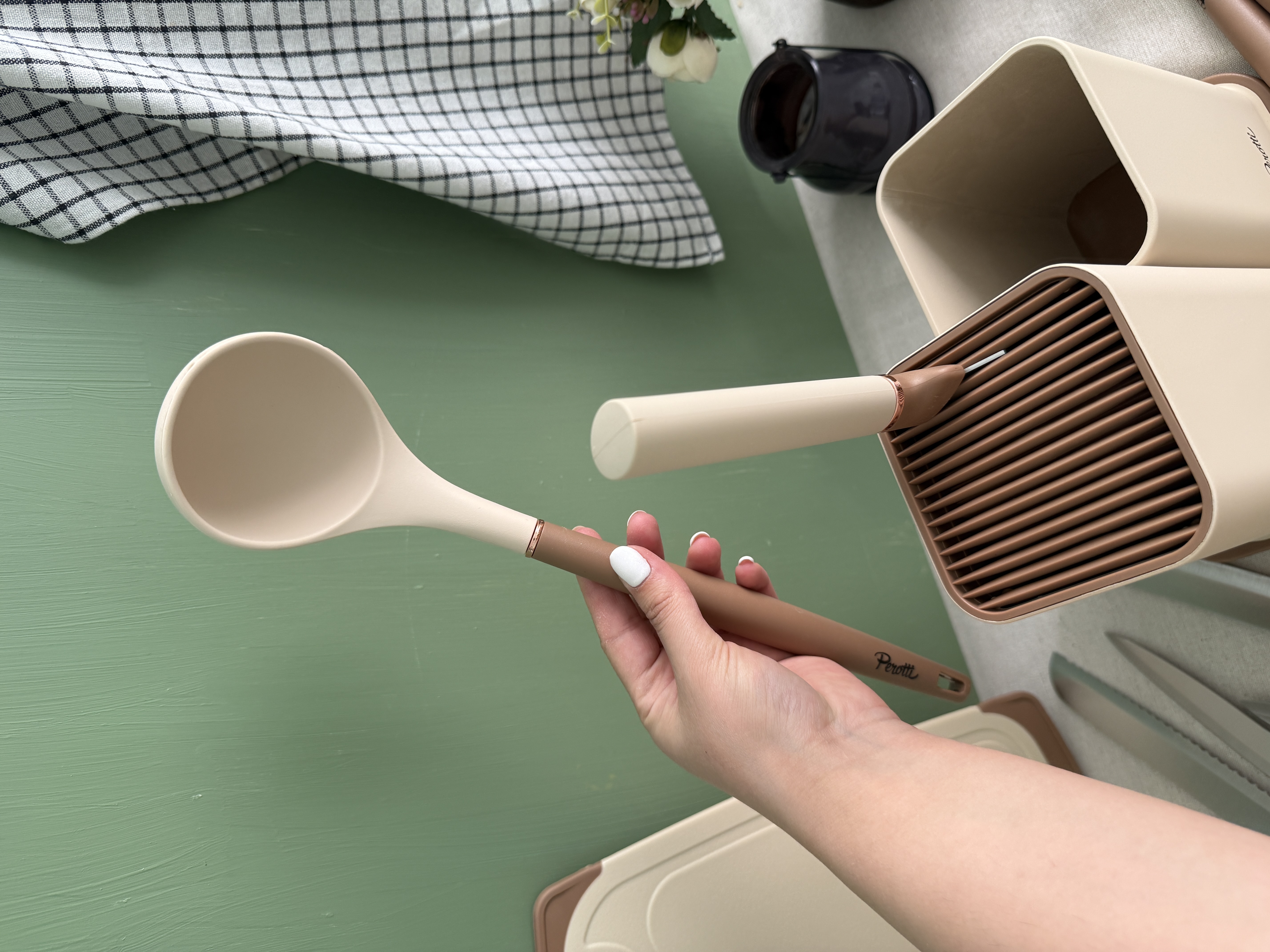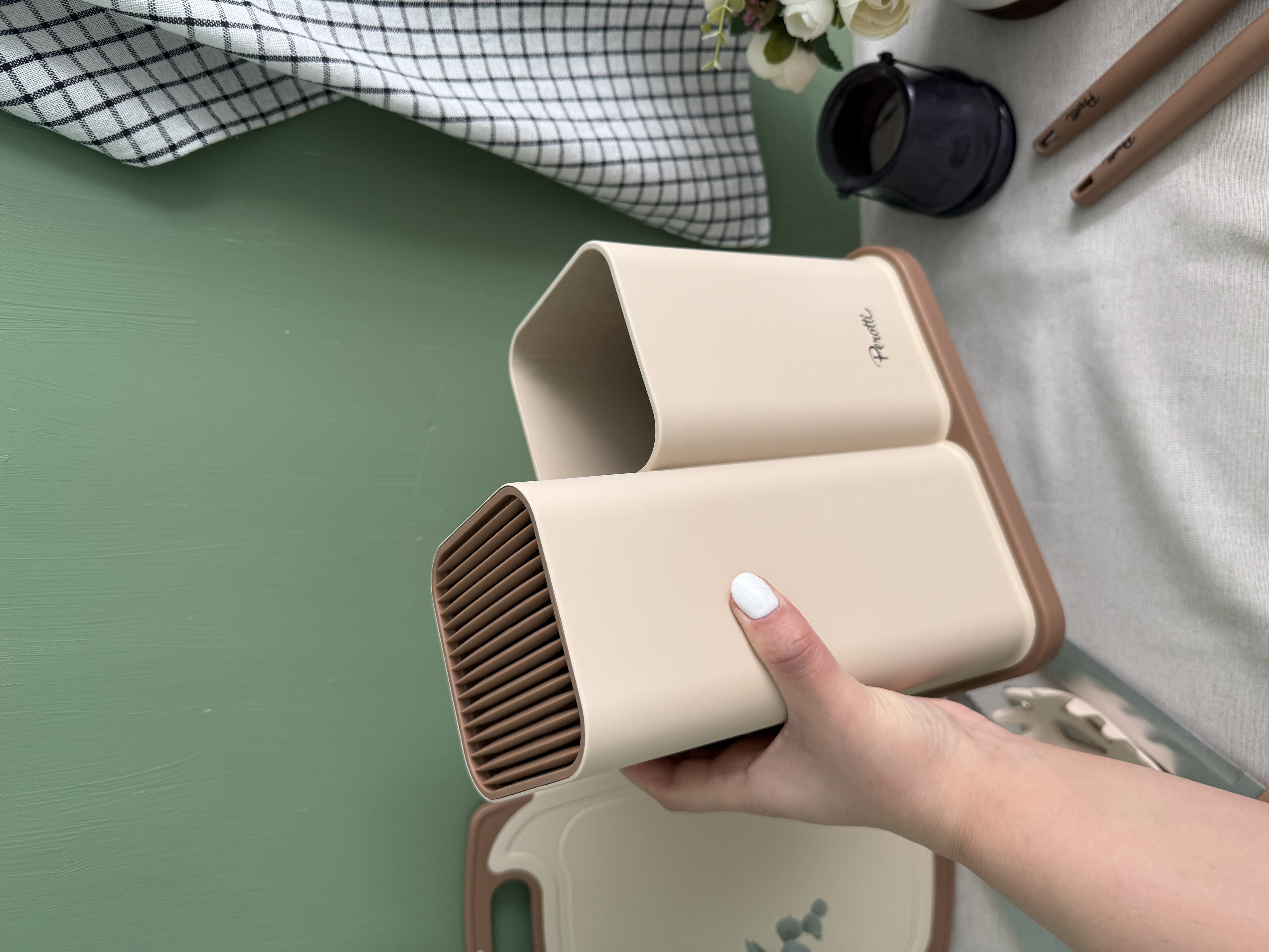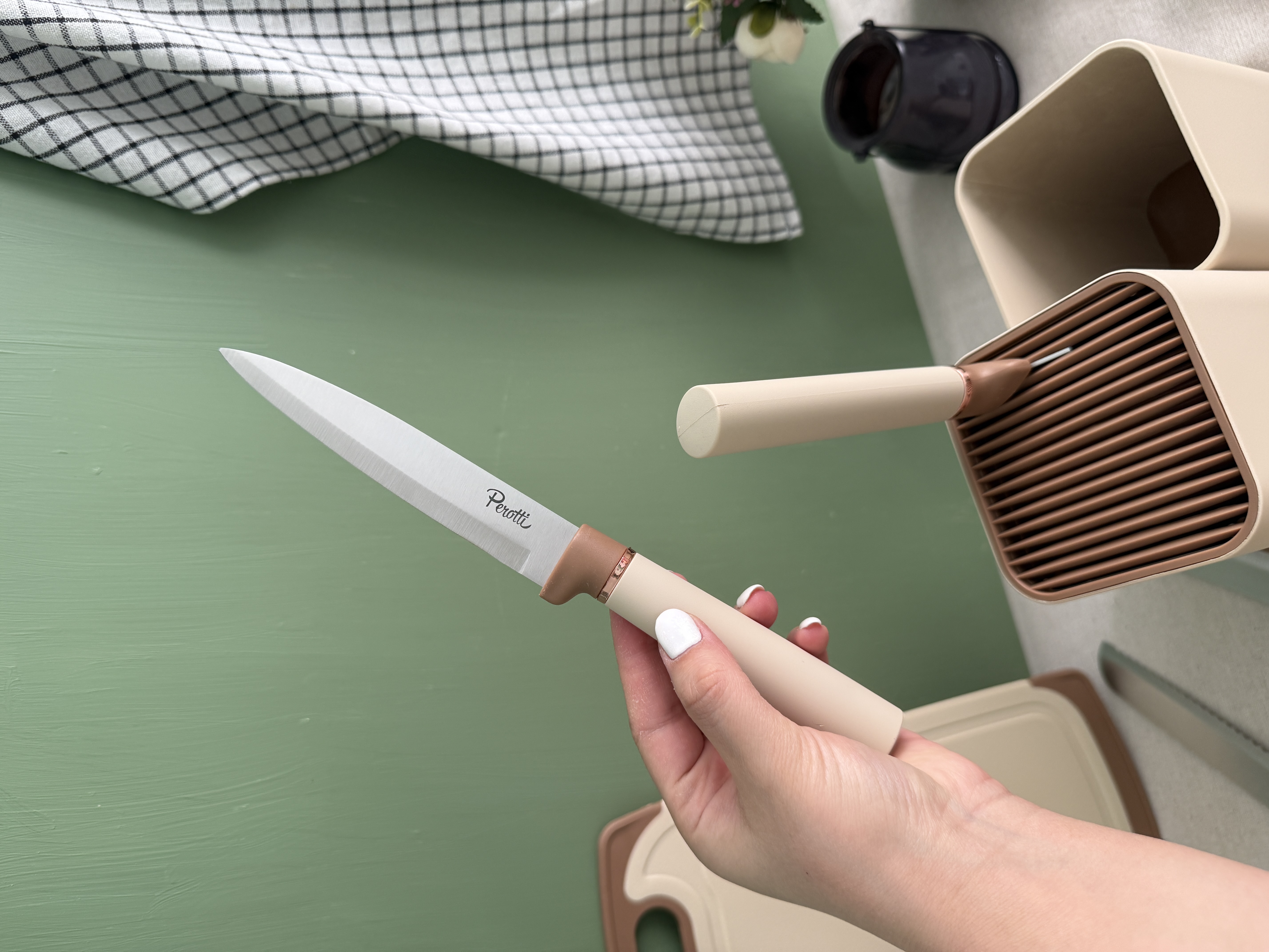 محصول وارداتی شامل استند مخصوص و جا ابزاری تخته برش ۵ عدد چاقوی تیز در سایز های مختلف دسته سیلیکونی ۵ تیکه کفگیر و ملاقه سیلیکونی دسته بامبو