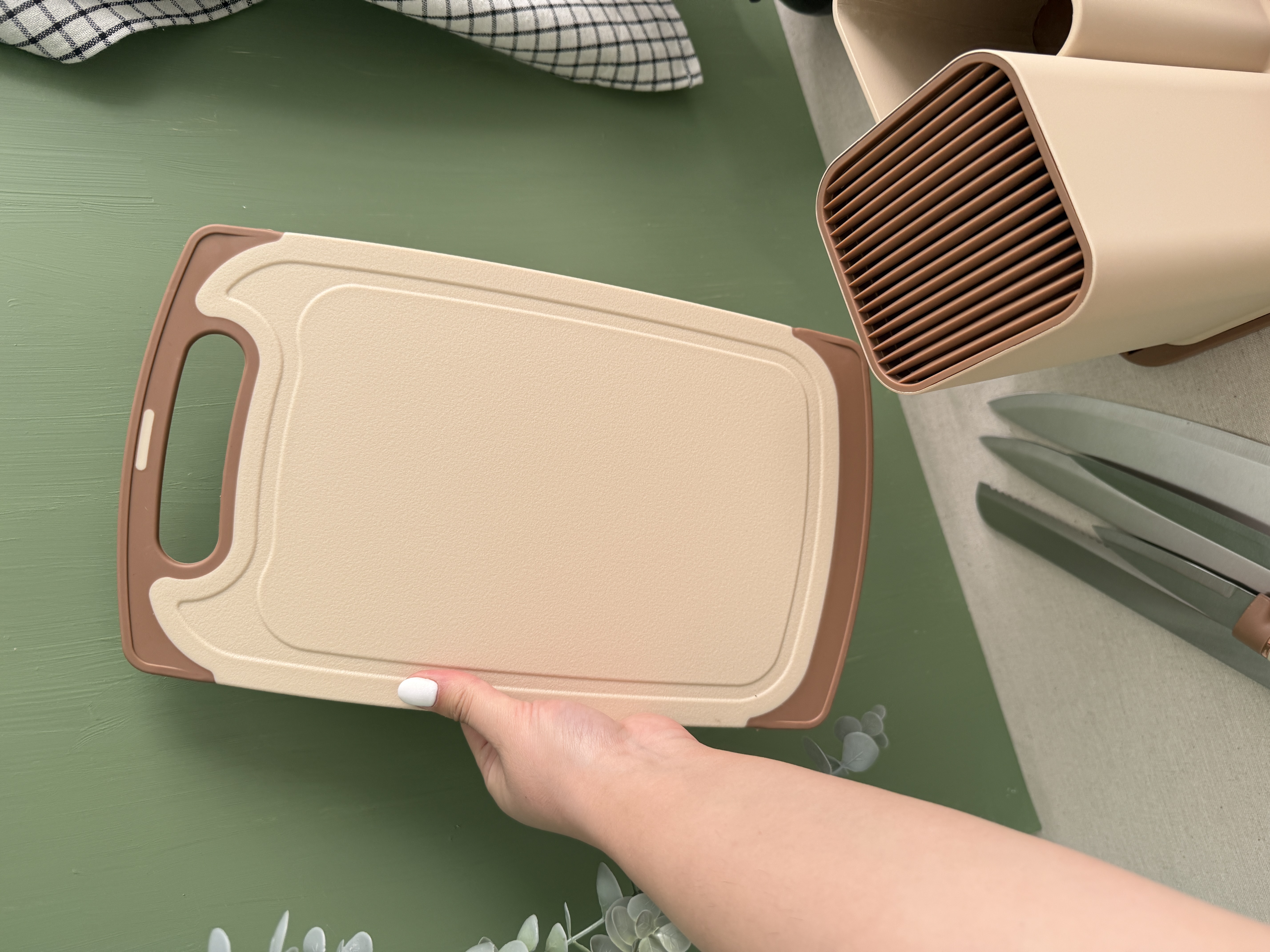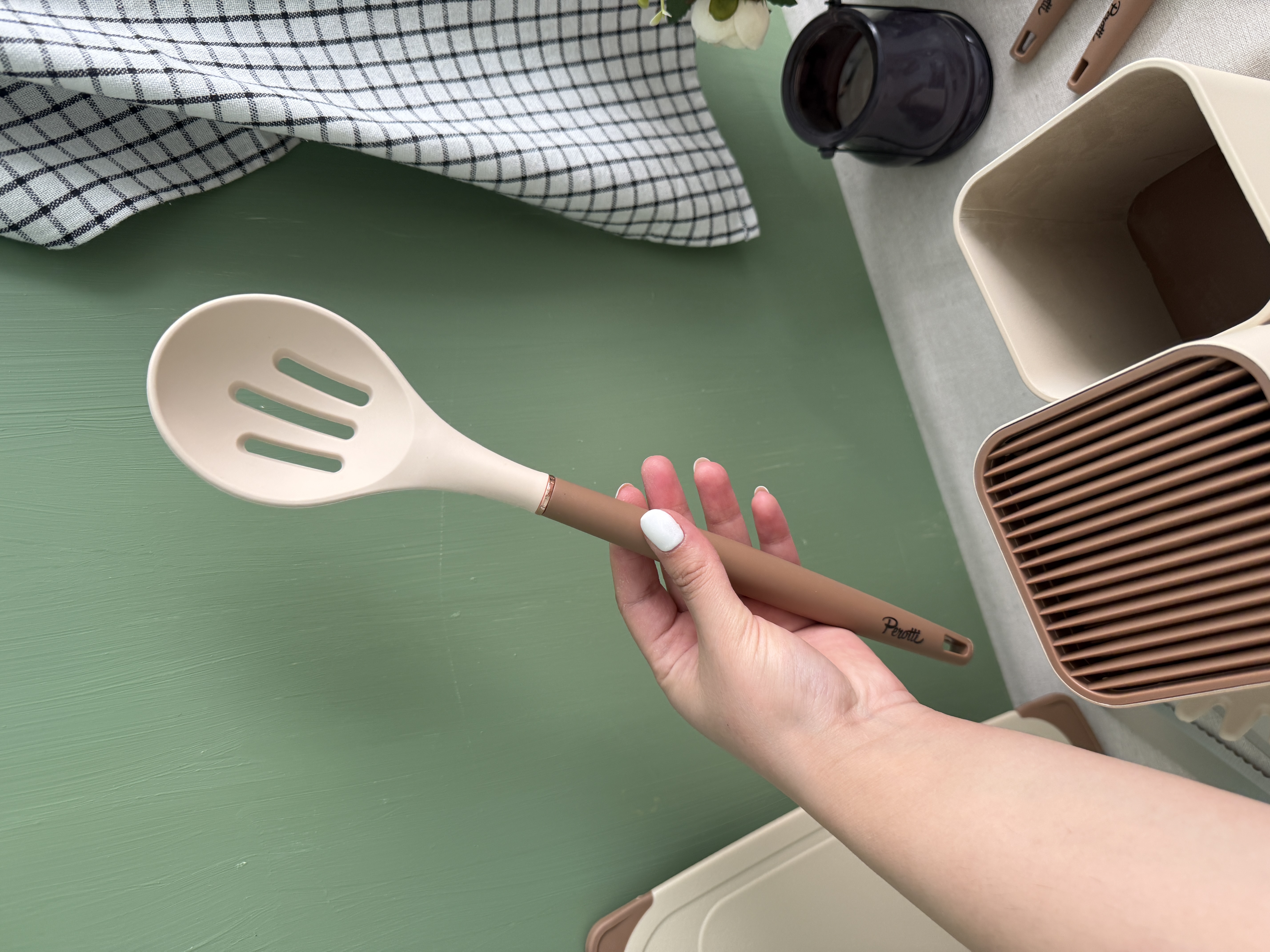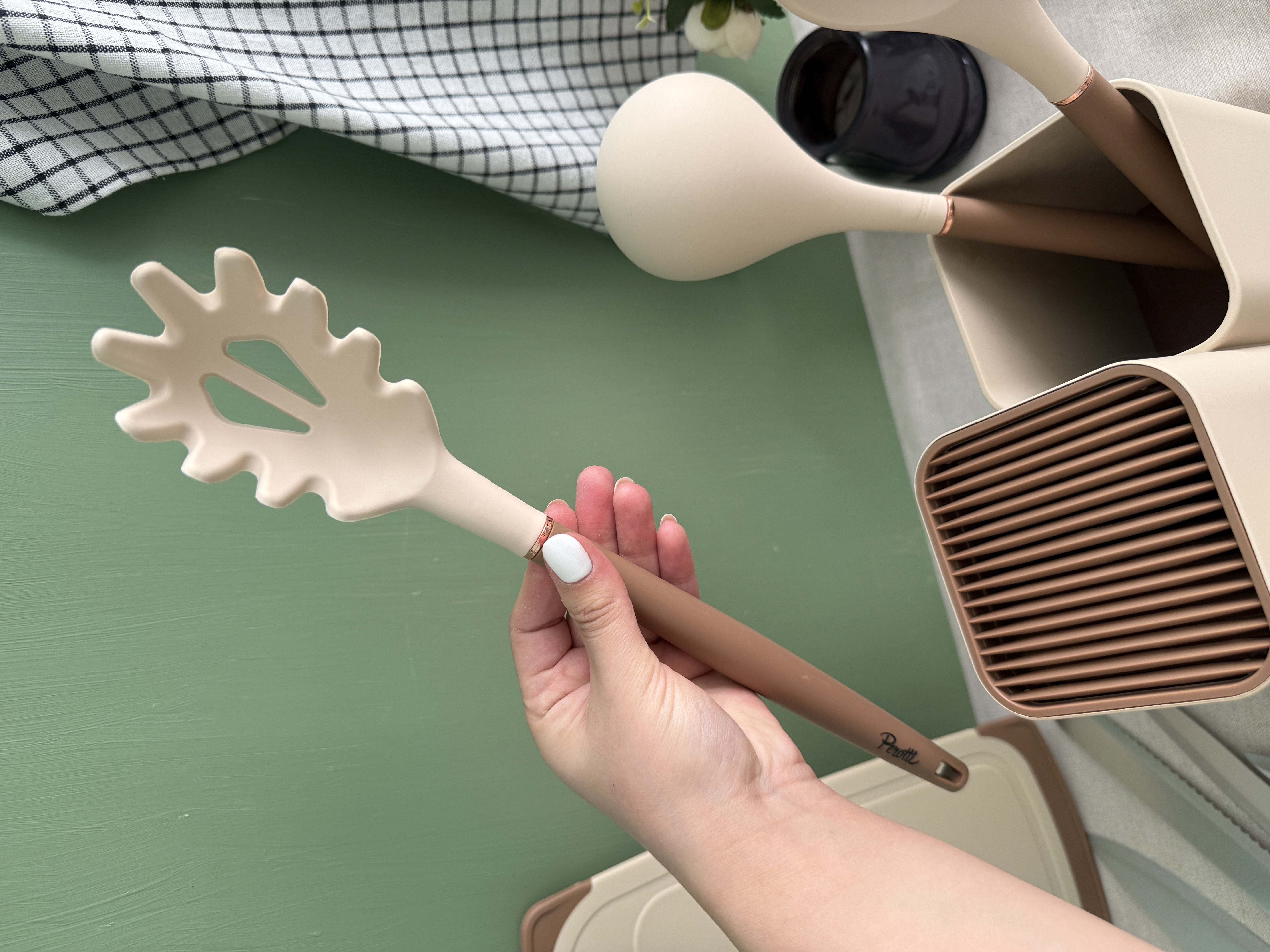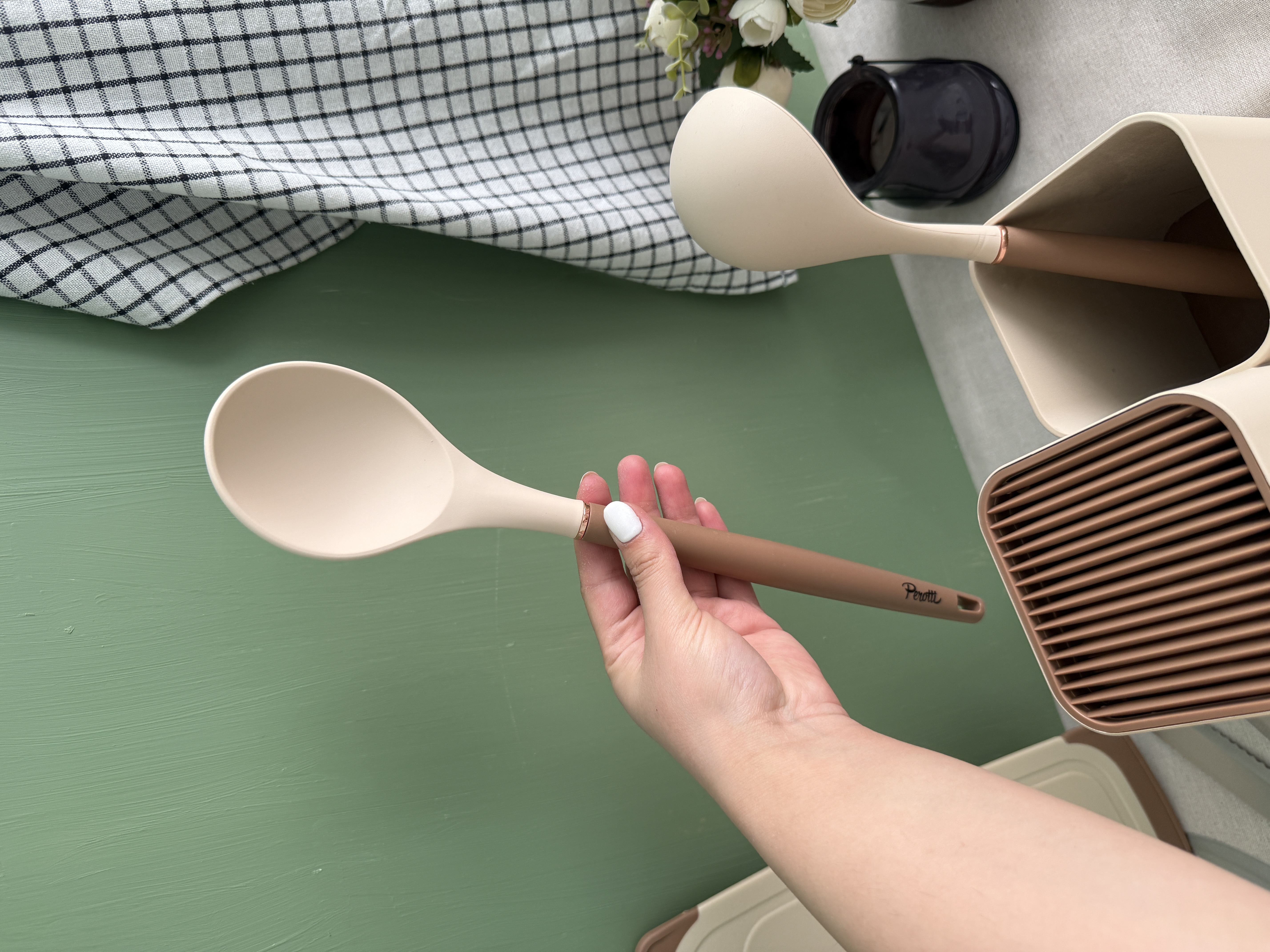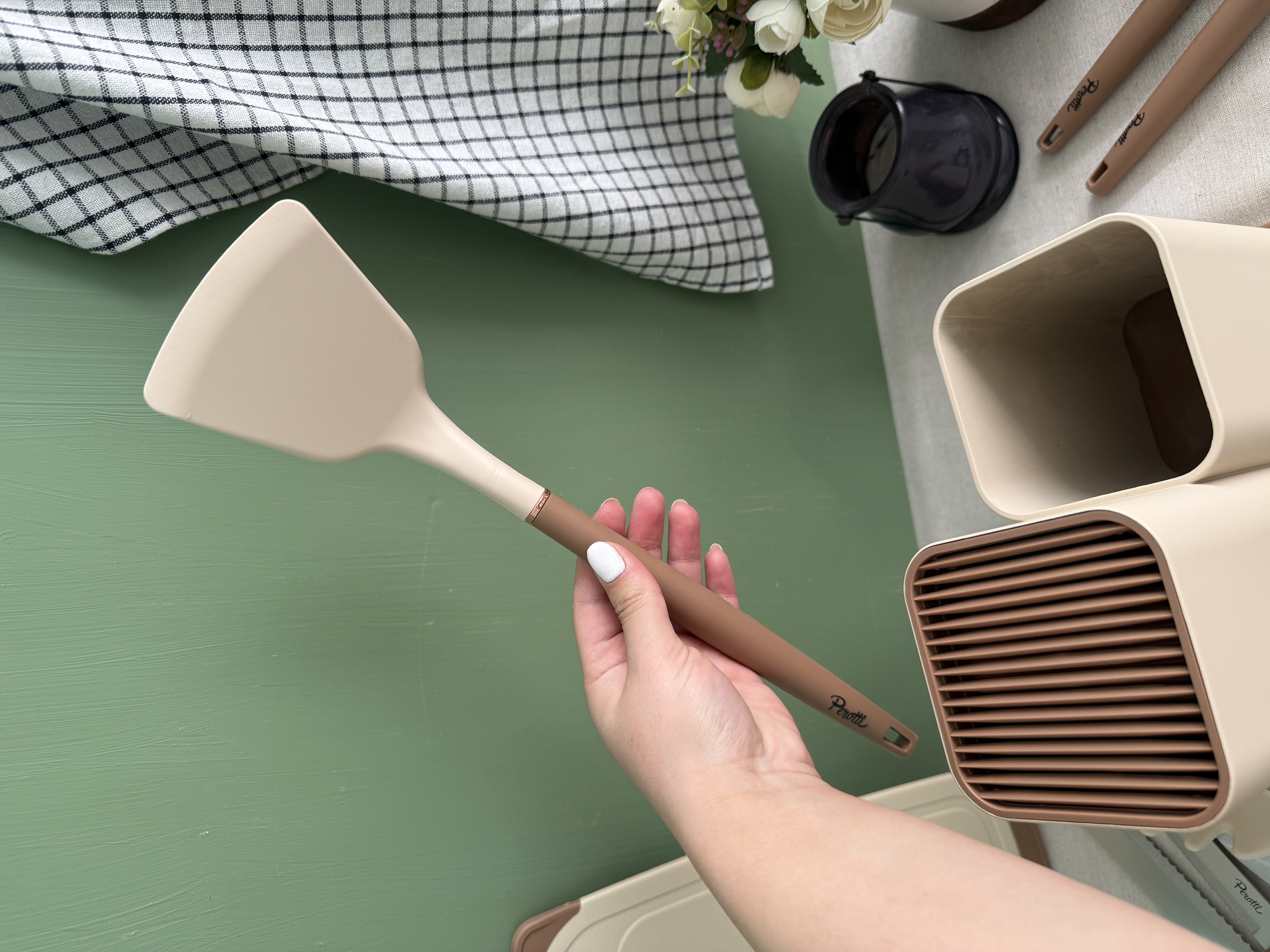 محصول وارداتی شامل استند مخصوص و جا ابزاری تخته برش ۵ عدد چاقوی تیز در سایز های مختلف دسته سیلیکونی ۵ تیکه کفگیر و ملاقه سیلیکونی دسته بامبو